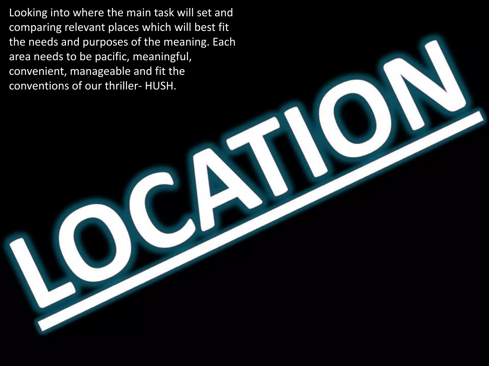 This document discusses location options for scenes in a thriller film called HUSH. It analyzes different areas that would suit the needs and purposes of the story. After considering conventions and practicality, the following locations are chosen: