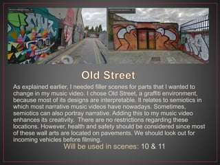 The document discusses several potential filming locations for scenes in a music video, including a graffiti area, art department room, park, bedrooms representing masculinity and femininity, living room, school hallway, and Leicester Square. Each location is proposed to suit different scenes based on the aesthetics, available space, and potential restrictions. Safety considerations are mentioned for locations near roads or requiring equipment.