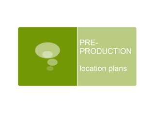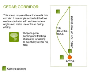 This document outlines pre-production location plans and camera positions for three scenes. The first scene takes place in a corridor and aims to get a panning shot of the actor walking. The second scene features an actor at a desk talking to the camera. Multiple angles will be used to keep the dialogue interesting. The third scene has an actor at a piano talking to the camera, with camera positions respecting the 180 degree rule.
