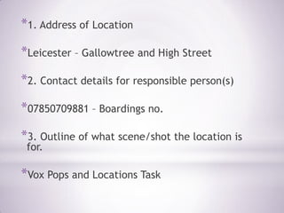 This document provides location details for a shoot in Leicester at Gallowtree and High Street. It lists contact information for the responsible person and outlines that the location will be used for vox pops and b-roll footage. Potential risks like electrical hazards, water, and crowds are noted. The document makes a suitability judgment for the producer and is signed by the responsible team member.