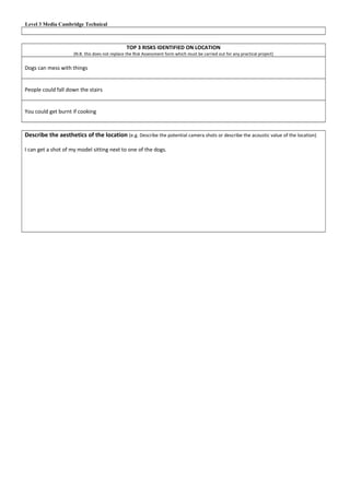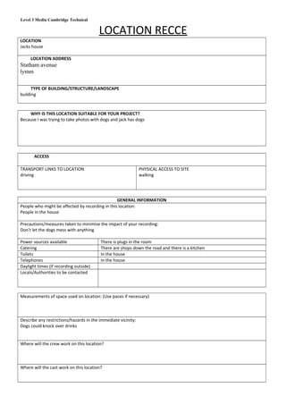 Jack's house in Statham avenue, Lymm was chosen as a suitable location because dogs were needed for photos. Access is by car and then walking inside the house. The main risks identified are the dogs potentially knocking things over or messing with items, people falling down the stairs, and burns from cooking. Good camera shots can be obtained of the model sitting next to one of the dogs inside the house.