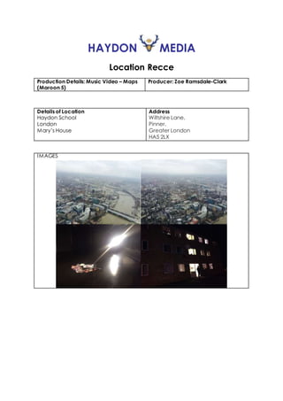 This document provides production details for a music video being filmed at various London locations. It discusses: