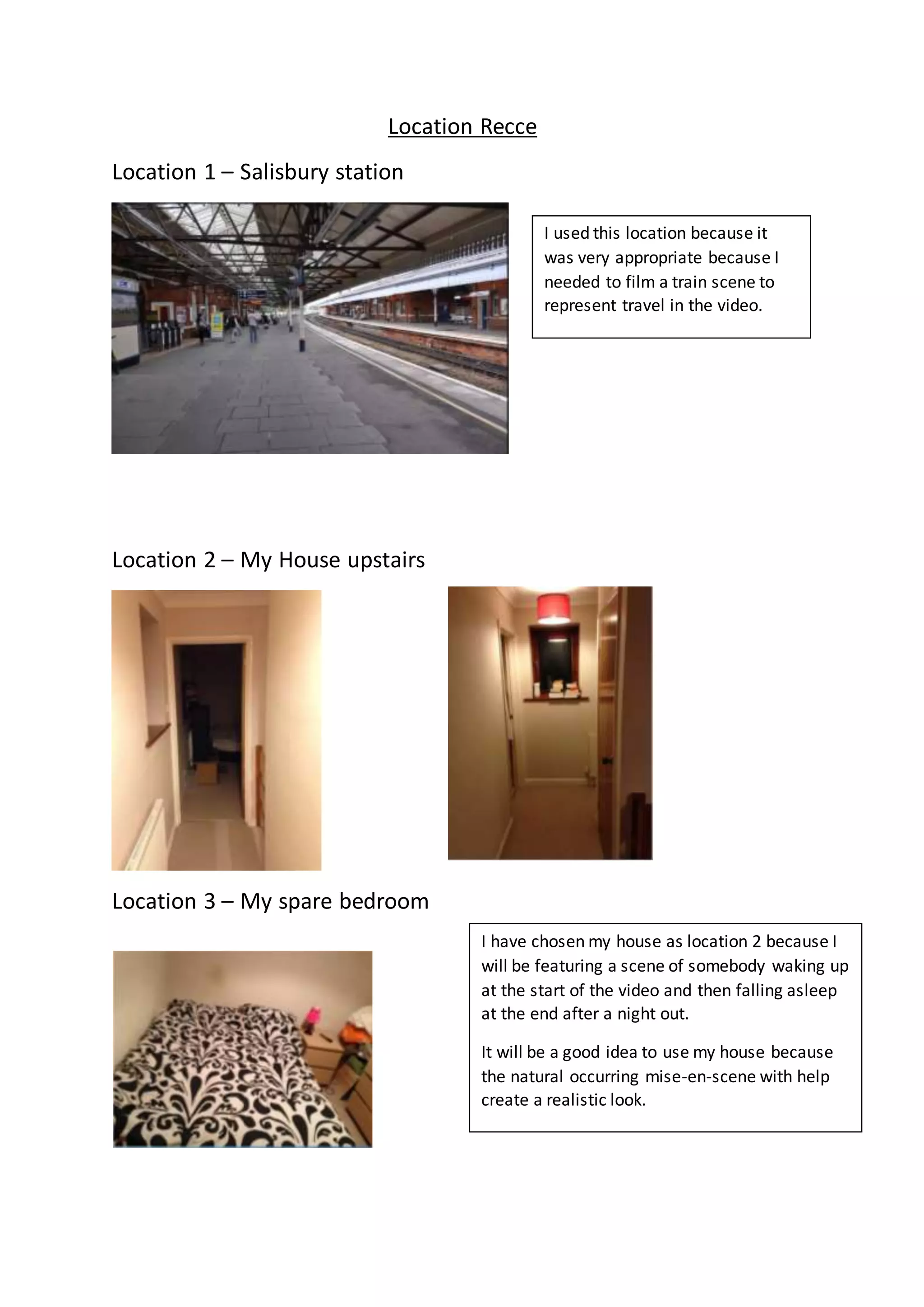 The document lists and describes 4 potential filming locations for a music video: Salisbury station for a train scene representing travel; the filmmaker's upstairs bedroom for scenes of waking up and falling asleep; their spare bedroom where the existing environment would help achieve realism; and a night club called Glam to feature clubbing and partying to match the dance track of the song.