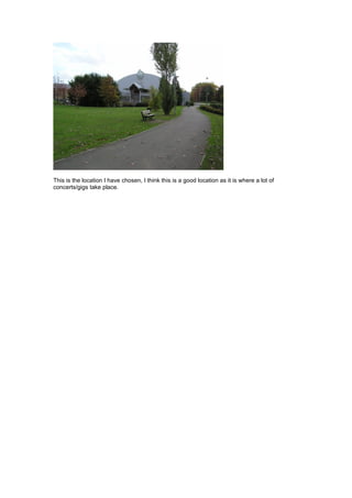The document provides details on the steps needed to scout a location for a video production. It involves examining the location to determine if it is suitable, identifying any equipment needs, checking for health and safety issues, finding interesting camera angles, and testing equipment. Permissions, parking, and communication with the crew also need to be arranged. The respondent chose a location where concerts often occur, making it well-suited for filming a person with a musical instrument.
