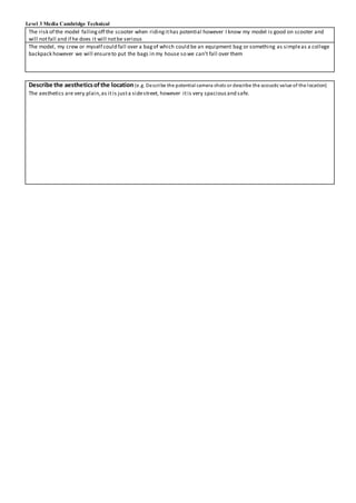 This document provides location details for a photoshoot at the front of the author's house located at 54 Severn Road. The house provides easy access, transport links via local bus stops and on foot through the front door. Precautions will be taken to minimize disruption to the author's parents who live there by scheduling around their work hours. Onsite amenities include power, catering, toilets, and phones. Recording will occur indoors during daylight. Risks include potential car accidents on the street, though the shoot will avoid the road, and falls from a scooter or over equipment bags, which will be stored indoors. The location provides a spacious and safe area for the shoot in the front