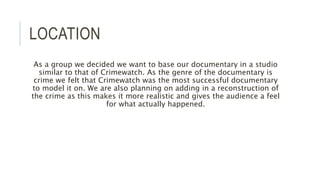 The group decided to model their crime documentary after Crimewatch by filming in a studio setting similar to it. They plan to include a reconstruction of the crime to make it more realistic for viewers. The documentary will focus on a case where a man attacked a woman in an empty car park late at night after following her from work for months. It will be called "Coventry Crackdown: The Westgate Robbery" and use green screen to make the studio scenes look professional like Crimewatch. An anonymous eyewitness will share their account from the safety and comfort of their own home to help with the sensitive nature of the case.
