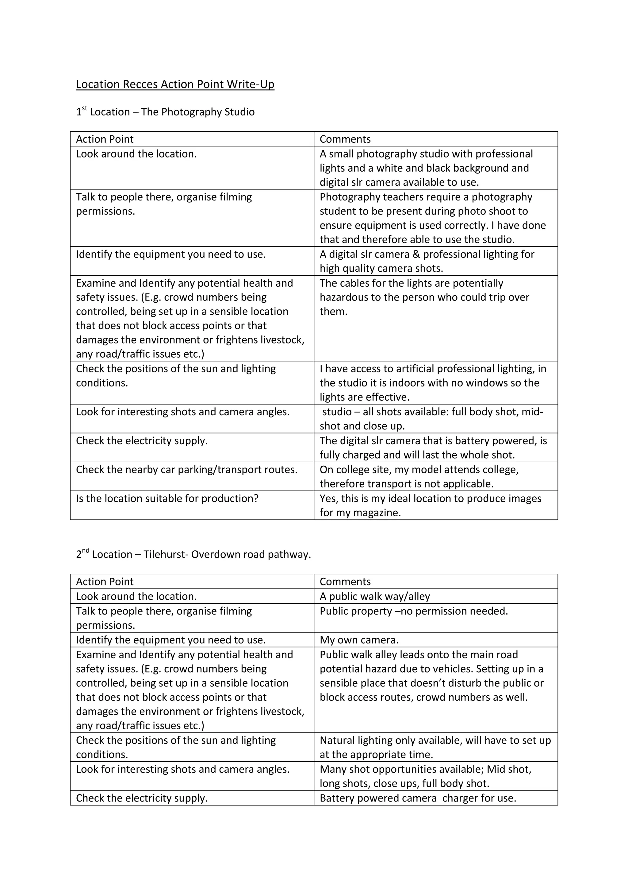 The photography studio is selected as the primary location due to convenient access to models and professional lighting for high quality shots while minimizing safety issues. The public pathway may also be used while taking precautions for its vehicle
