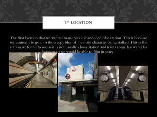 The document discusses location scouting for a film. The first location is an abandoned tube station to portray the creepy idea of the main character being stalked, as it is not a busy station with few trains. The second location wanted is a wooded or grassy area to show the girl first being followed by the stalker at the opening of the film.