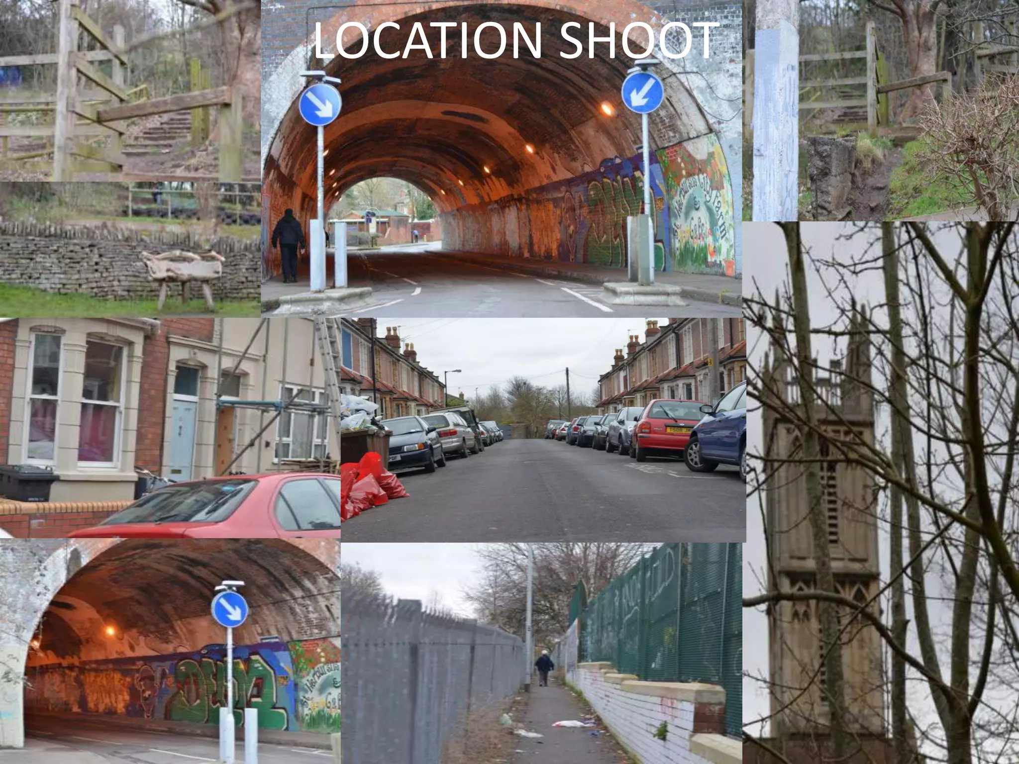 This document provides location shots for a film shoot, including establishing shots of a tunnel, lane, church scenery, gas hills, railway, lane opening, houses, and road. The shots are described as reinforcing the urban and rural settings, with dim lighting, street art, and bone-like structures to create an eerie and spooky atmosphere in line with psychological horror conventions. Close-up shots of the tunnel and POV shots are meant to create a sense of panic and danger for the protagonist.