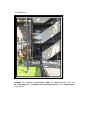 Stockwell flats are chosen to symbolize crowded council housing in London and social class differences. Stockwell estate is selected because its layout of red brick buildings surrounded by shade would create a mood of dullness and imprisonment. Brixton prison is picked as it is typical of English prisons depicted in the video's story. Brandon blocks are proposed to show a character living in poor conditions, conveying the message of the video.