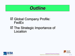 The document discusses various location strategy considerations for operations management. It covers factors that affect location decisions such as labor productivity, exchange rates, political risks, and proximity to markets/suppliers. Methods for evaluating location alternatives are described, including the factor-rating method, locational break-even analysis, and center-of-gravity method. Specific location strategies for different industries like hotels, call centers, and how companies use geographic information systems are also summarized.