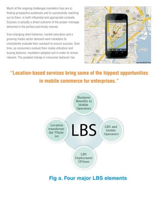 The document discusses the evolving landscape of location-based services (LBS) and their impact on marketing, consumer behavior, and enterprise applications. It highlights the growth potential of LBS due to increasing demand for location-enabled apps and technologies, driven by mobile users and evolving market needs. The paper also emphasizes the importance of advanced and secure LBS applications for enterprises in optimizing asset and workforce management while addressing privacy concerns.
