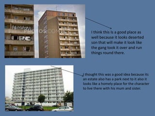 This document discusses potential filming locations, suggesting an estate that has a park next to it as a good place for a character to live with his mother and sister, as well as for running scenes during the day and creating a frightening atmosphere at night with groups of youths. It also notes an abandoned-looking area could work for a gang taking over.