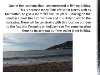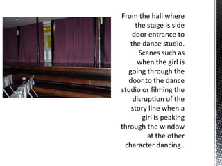 This document discusses potential locations for filming scenes that represent everyday life and create a sense of realism. It proposes a dance studio for a scene showing the stage from the audience's perspective. Another suggestion is a housing estate for a scene of girls leaving home with suitcases for the airport to represent going to Ibiza, which would mimic typical housing and add authenticity. A third location proposed is a bedroom for a scene of a girl receiving an email job opportunity, continuing the goal of realistic settings.