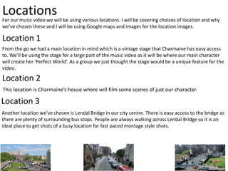 Locations For our musicvideo we will be using various locations. I will be covering choices of location and why we’ve chosen these and I will be using Google maps and images for the location images. Location 1 From the go we had a main location in mind which is a vintage stage that Charmaine has easy access to. We’ll be using the stage for a large part of the music video as it will be where our main character will create her ‘Perfect World’. As a group we just thought the stage would be a unique feature for the video. Location 2 This location is Charmaine’s house where will film some scenes of just our character. Location 3 Another location we’ve chosen is Lendal Bridge in our city centre. There is easy access to the bridge as there are plenty of surrounding bus stops. People are always walking across Lendal Bridge so it is an ideal place to get shots of a busy location for fast paced montage style shots.