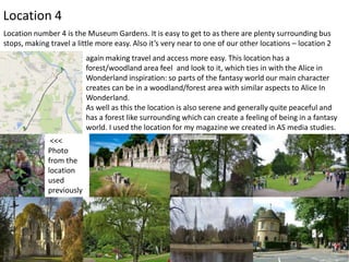 The document discusses 7 potential locations for filming a music video. Location 1 is a vintage stage that will be the main setting. Location 2 is the lead actress's house. Location 3 is a city bridge that allows montage shots. Location 4 is a park with a forest area suitable for portraying a fantasy world. Location 5 is a nearby wood for more fantasy scenes. Location 6 is a walking path through a field and tunnel. Location 7 is a pond that can represent the fantasy land.