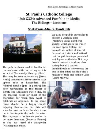 The document discusses locations used in a trailer for a media project created by students Liam Quinn, Terna Jogo and Syan Magahy. Several locations are discussed, including the Admiral Hawk Pub, Sunbury Park, Sunbury Graveyard, Forge Lane, and a dark room at St. Paul's Catholic College. The pub is used to establish the working class setting. Sunbury Park shows a happy dating scene in a flashback. The graveyard creates suspense as the villain is dragged toward it. Forge Lane provides more context. The dark room leaves the audience with a cliffhanger by showing the main character opening his eyes at the end.