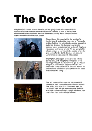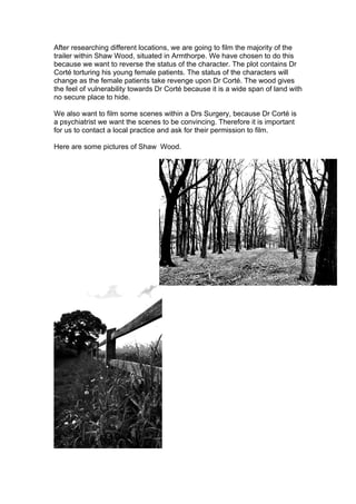 The document discusses filming locations for a horror film trailer about a doctor named Dr. Corté. It analyzes locations used in horror films like Ginger Snaps 3 and The Orphan that contribute to a sense of isolation and vulnerability. The document proposes filming most of the trailer in Shaw Wood, a large wooded area, because it will make Dr. Corté feel vulnerable as his female patients seek revenge against him in the open space. Some scenes will also be filmed in a doctor's surgery to authenticly portray Dr. Corté's role as a psychiatrist.