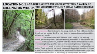 The document discusses 5 potential locations for filming scenes for a music video about a couple's relationship. Location #1, Millington Woods, is an ancient ash wood suitable for intimate scenes of 1-2 subjects. Location #2, Fangfoss Jubilee Park, could show playful scenes between two people and has different areas for variety. Location #3, Goodmanham Arms pub, provides a cosy setting for date scenes or conversations over food and drink. Location #4, the York Christmas fair, could feature happier scenes of the couple attending the festive market together. Finally, Location #5, fields in Wilberfoss, would work for peaceful or lonely scenes featuring nature and sunsets.