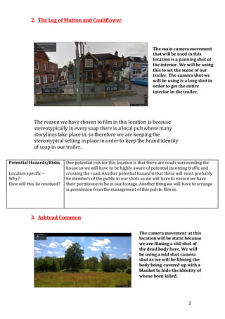 3) Ashtead Common, where a murder scene will be filmed. Potential risks include traffic when traveling between locations and allergies to the outdoor environment. Public permission is also required.