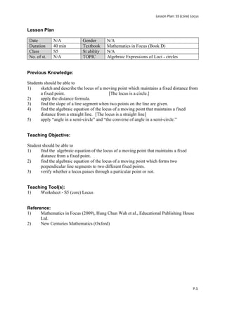 The document outlines a 40-minute lesson plan on finding algebraic expressions for loci that are circles. It reviews how a circle is defined as the locus of points equidistant from a fixed point. Students then learn to find the equation of a circle given the center and radius through an online video example. The lesson also covers finding the equation of a circle when a moving point forms perpendicular line segments to two fixed points, using the concept of angles in semi-circles. Students practice these skills through worksheet questions, with the teacher demonstrating an example before each practice session.