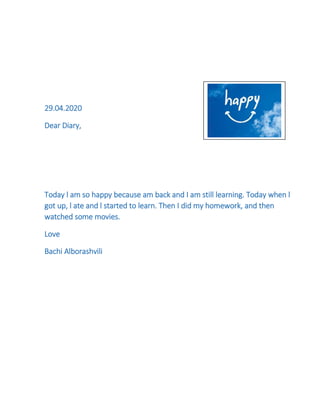 Bachi had a happy day learning at home. Saba found online lessons boring but was happy to spend more time with family, though disappointed plans were cancelled due to Covid-19. Dato had a normal day of online lessons, meals, and movie watching.