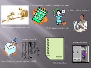 The school needs to measure locker space, calculate the number required based on student enrollment, define a budget and timeline to install new lockers. They will conduct market research, survey students for design preferences, create a prototype, get feedback, and then construct the new lockers.