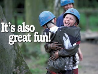 Manor Adventure is an outdoor activity provider established in 1991 that operates centers in the UK and France. It handles over 27,000 students and 500 families annually across its four centers. It offers a variety of outdoor adventure courses focused on developing young people's confidence, self-esteem, social skills and teamwork through approximately 19 activity sessions per week. Safety is the top priority, with strict health and safety practices, certifications and monitoring of instructors and equipment.