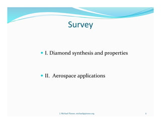 This document discusses the synthesis and properties of chemical vapor deposited (CVD) diamond and its applications in aerospace thermal management. CVD diamond has exceptional thermal conductivity, hardness, and optical transparency. It can be used as a heat spreader to improve the thermal performance of electronics like microprocessors and GaN transistors. For aerospace applications like the F-35 fighter jet, CVD diamond heat spreaders, heat pipes and composites could help reduce thermal resistance and improve thermal transfer between avionics systems and fuel to address overheating issues at the end of missions when fuel levels are low.