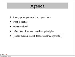 This document discusses the LOCKSS-USDOCS project, which aims to replicate the Federal Depository Library Program (FDLP) in a digital environment. It summarizes that LOCKSS is an open source digital preservation system that distributes content across a peer-to-peer network of libraries. LOCKSS-USDOCS currently preserves digital content from GPOaccess and the Federal Digital System, including the Federal Register and Code of Federal Regulations. The project aims to expand participation from more libraries and collections over time.