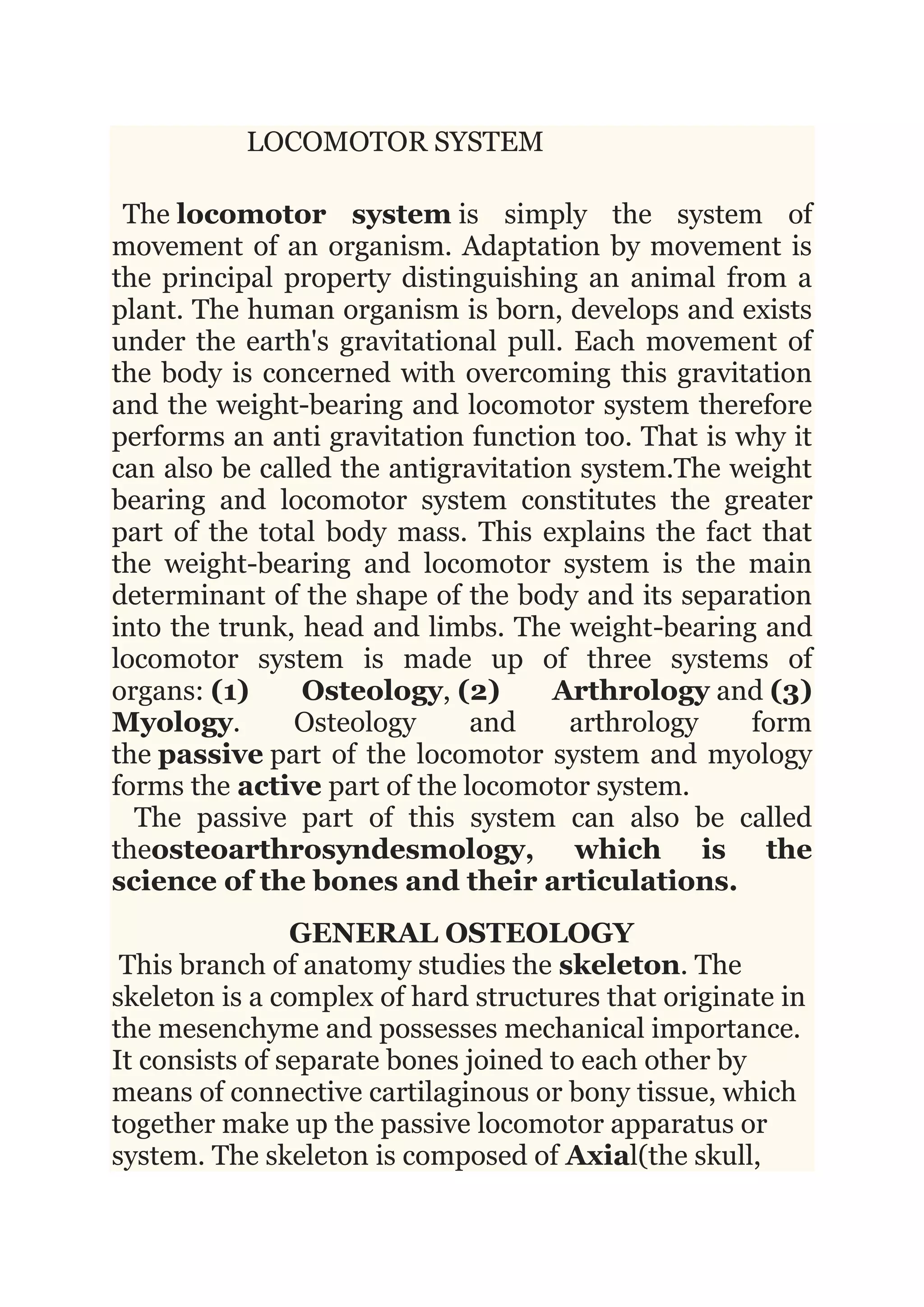The document summarizes the three main systems that make up the human locomotor system: osteology, arthrology, and myology. Osteology is the study of bones and how they form the skeleton. Arthrology studies joints and their classification. Myology covers the muscular system, including muscle structure, function, and types. Together, these three systems work passively and actively to enable movement and overcome gravity.