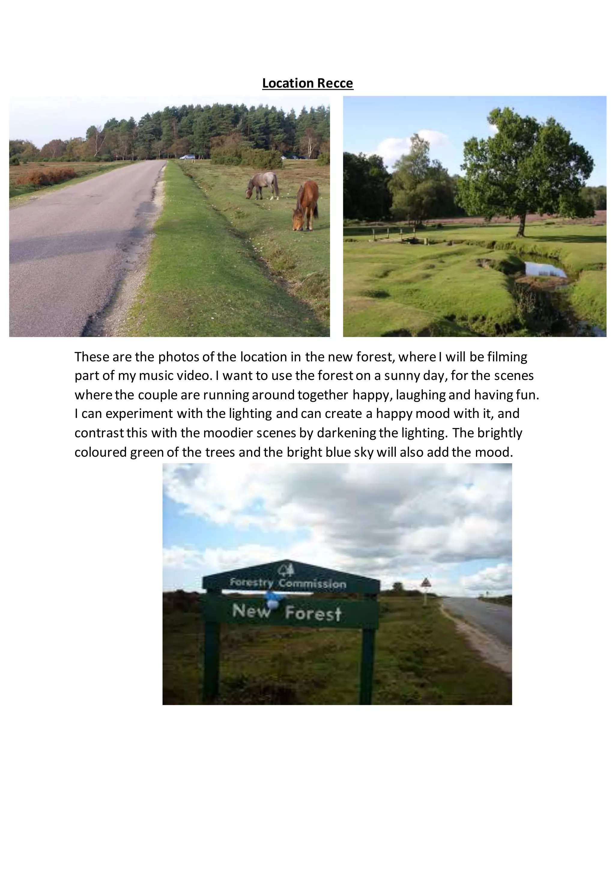 The document discusses location scouting for a music video. It describes taking photos in a forest to film happy scenes of a couple running around on a sunny day, experimenting with lighting to contrast with moodier scenes. It also mentions using a beach in Bournemouth for romantic couple scenes on a sunny day, and filming sad solo scenes on stormy days to help set the mood.