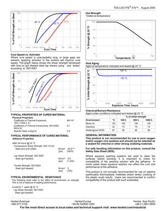 LOCTITE 574 is an acrylic-based anaerobic sealant that cures in the absence of air between close-fitting metal surfaces. It is a thixotropic paste that seals close-fitting joints and flanges to provide immediate resistance to low pressures. The technical data sheet provides details on product description, typical properties before and after curing, curing performance under different conditions, environmental resistance, instructions for use, and specifications.