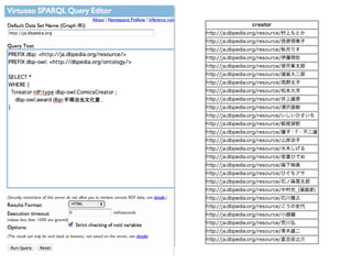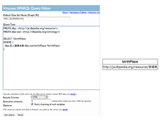 – SPARQLエンドポイントURI • プログラムからSPARQLを使うときに指定 – 入力フォームがある場合もあり • リスト – hYp://www.w3.org/wiki/SparqlEndpoints – hYp://ckan.net/dataset?res_format=api %2Fsparql&q=sparql – hYp://labs.mondeca.com/sparqlEndpointsStatus/
