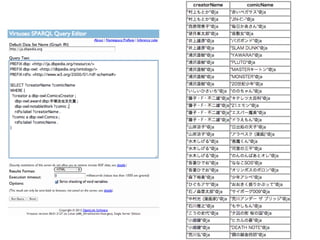 PREFIX dbp: <http://ja.dbpedia.org/resource/> PREFIX dbp-owl: <http://dbpedia.org/ontology/> SELECT ?creatorName ?comicName WHERE { ?creator a dbp-owl:ComicsCreator ; dbp-owl:award dbp:手塚治虫文化賞 ; dbp-owl:notableWork ?comic ; rdfs:label ?creatorName . ?comic a dbp-owl:Comics ; rdfs:label ?comicName . } サイボーグ009 dbp-‐owl:Comics rdfs:label rdf:type dbp-‐owl:AdministraVveRegion dbp:サイボーグ009 rdf:type dbp-‐owl: dbp-owl:notableWork ComicsCreator rdfs:label dbp:宮城県 rdf:type dbp-owl:birthPlace dbp:石ノ森章太郎 宮城県 rdf:type foaf:Person dbp-owl:leaderName dbp-prop:生年 rdfs:label dbp-owl:award dbp:村井嘉浩 1938 dbp:手塚治虫 石ノ森章太郎 文化賞