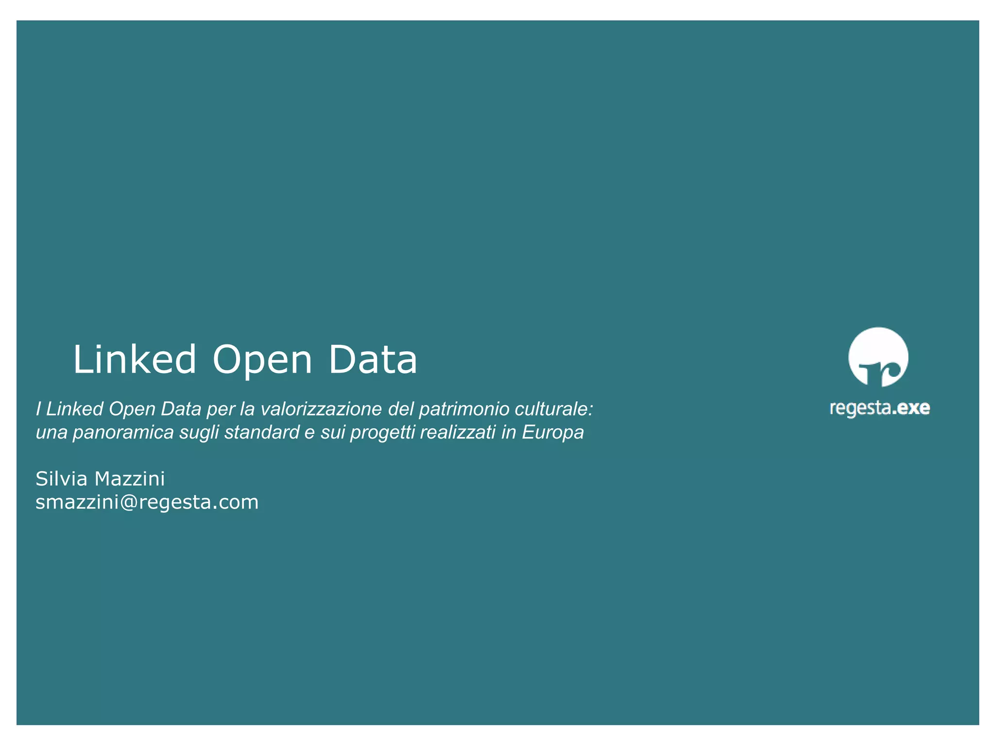 Il documento fornisce una panoramica sui Linked Open Data (LOD) e la loro applicazione nella valorizzazione del patrimonio culturale in Europa, evidenziando standard e progetti realizzati. Sottolinea l'importanza dell'interoperabilità semantica e dei modelli dati come RDF per lo scambio e il riutilizzo delle informazioni. Viene inoltre illustrato l'uso di vocabolari strutturati come FOAF, Dublin Core e SKOS per facilitare la descrizione e l'accesso ai dati.