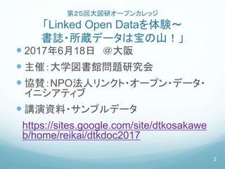 2017年6月18日 @大阪 主催:大学図書館問題研究会 協賛:NPO法人リンクト・オープン・データ・ イニシアティブ 講演資料・サンプルデータ https://sites.google.com/site/dtkosakawe b/home/reikai/dtkdoc2017 2