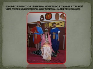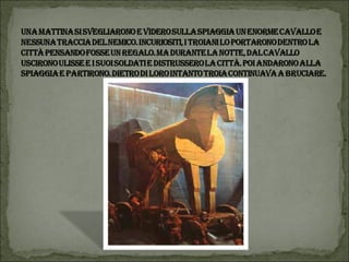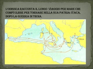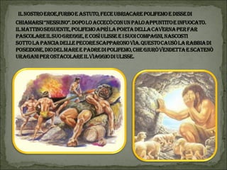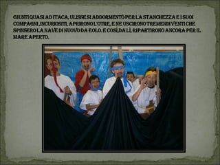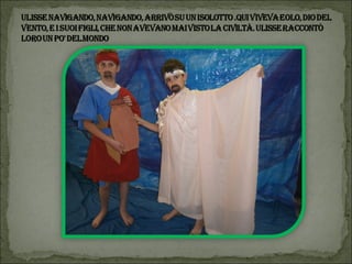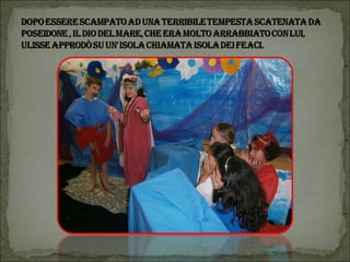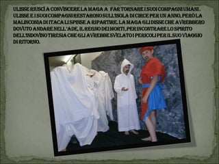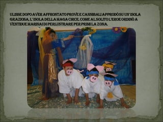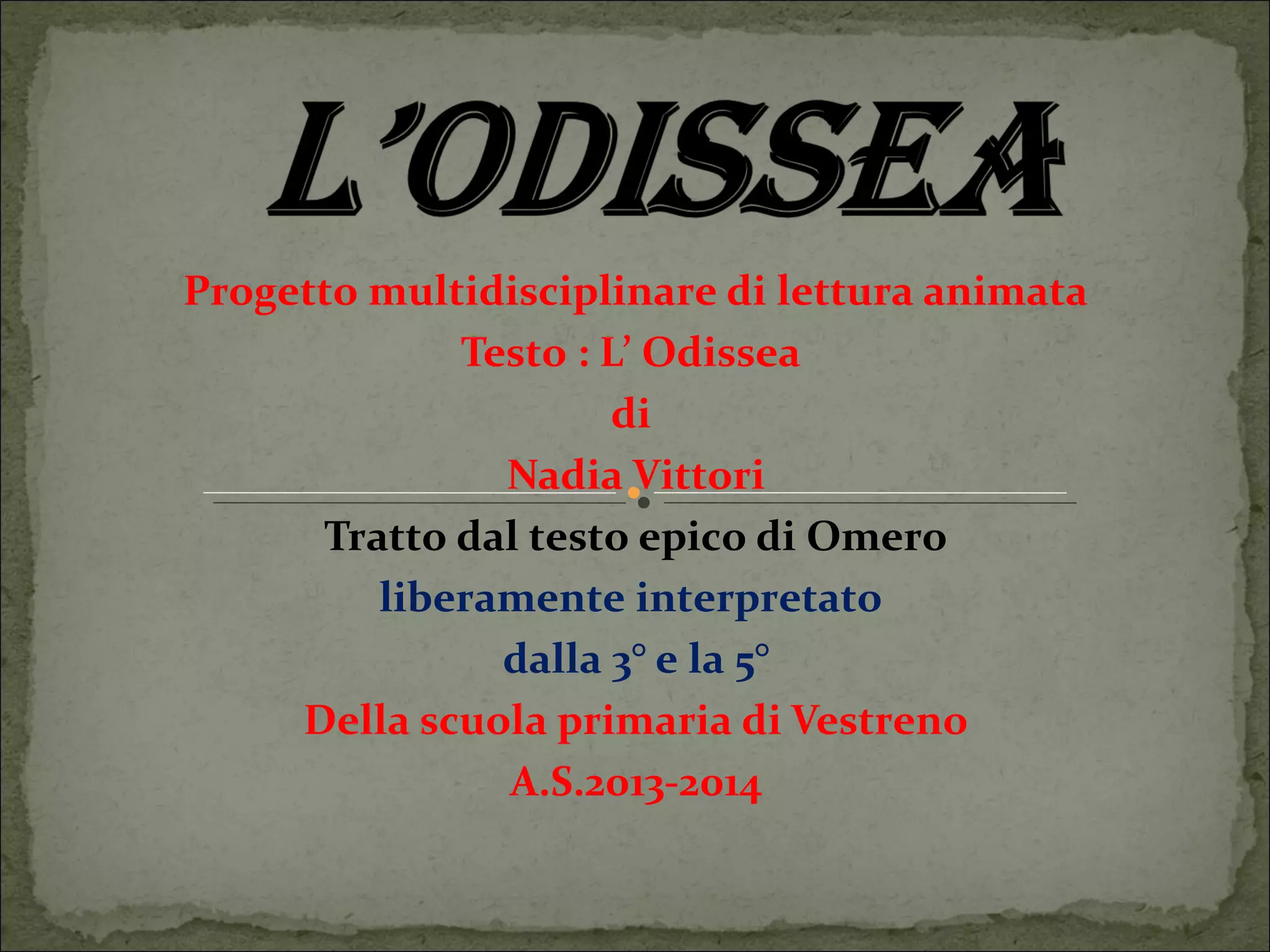Il documento descrive un progetto multidisciplinare di lettura animata basato su 'L'Odissea', con l'interpretazione da parte degli alunni della scuola primaria di Vestreno. Viene narrata la fuga di Elena con Paride a Troia e le avventure di Ulisse nel suo viaggio di ritorno verso Itaca, affrontando diversi ostacoli e creature mitologiche. Il progetto è inoltre un tributo a coloro che hanno collaborato, tra cui insegnanti e volontari.