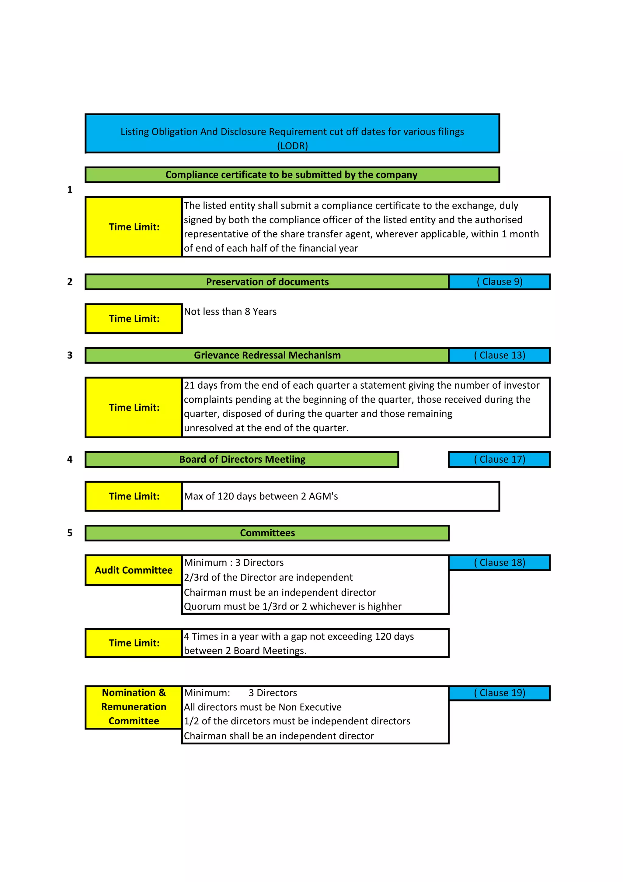 The document outlines various time limits and compliance requirements for listed entities as per the SEBI (Listing Obligations and Disclosure Requirements) Regulations 2015. Some key requirements include having a minimum of 3 directors on the board, holding board meetings at least once every 120 days, forming committees like the audit committee and nomination & remuneration committee, and quarterly and annual financial disclosures within 45 and 60 days respectively of the end of the period. It also specifies various other periodic disclosures around shareholding patterns, outcome of board meetings, related party transactions, and procedures regarding share transfers within prescribed timelines.