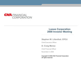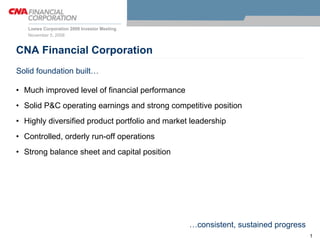 The document provides an overview of Loews Corporation's 2008 investor meeting. It summarizes CNA Financial Corporation's solid financial performance including improved operating earnings, a strong balance sheet, and steady core securities income. It also discusses CNA's property and casualty operations which drive the company's results, and how its controlled, orderly run-off operations mitigate earnings risks. Additionally, it outlines CNA's highly diversified insurance portfolio, market leadership in specialty businesses, and disciplined underwriting approach.