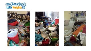Social Enterprise Trading for Good provides decluttering and home cleaning services to create safer homes and improve life chances for young adults in Suffolk. Their services include home and garden decluttering, small jobs assistance, hospital discharge cleaning, downsizing assistance, and hoarding disorder support. Hoarding disorder is now recognized as a mental health condition involving excessive acquiring and disorganized storing of items. Self-neglect involves lack of self-care that threatens one's health and safety. Building rapport, avoiding judgment, and partnership between individuals and organizations are essential to help those affected by hoarding disorder and self-neglect.