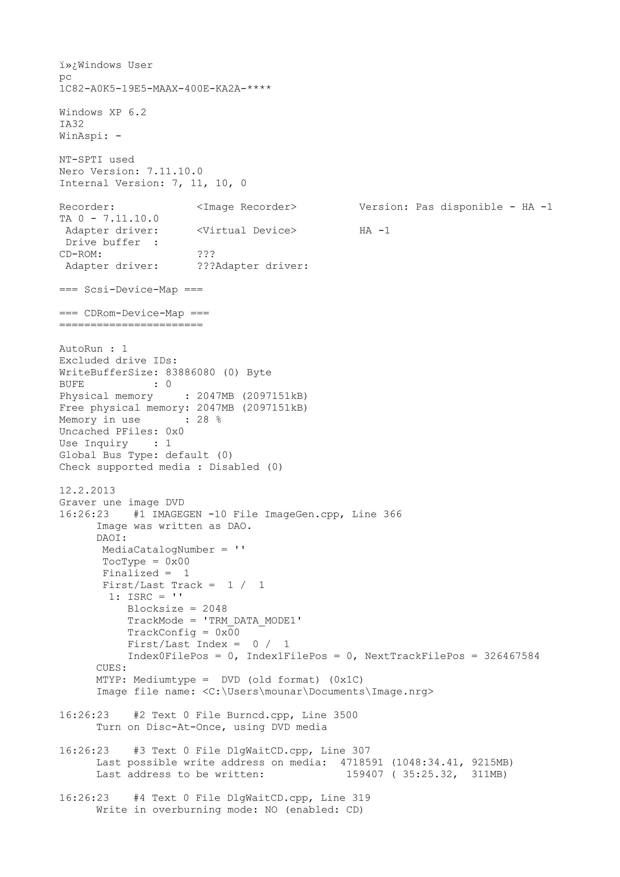 This document summarizes a burn attempt using Nero to write an image file to DVD media. The burn was started using Disc-at-Once mode on DVD media but was aborted by the user after the recorder preparation and setup were completed. The log provides details on the software and hardware configuration, the image file being written, and playbacks the activities up until the user aborted the burn process.