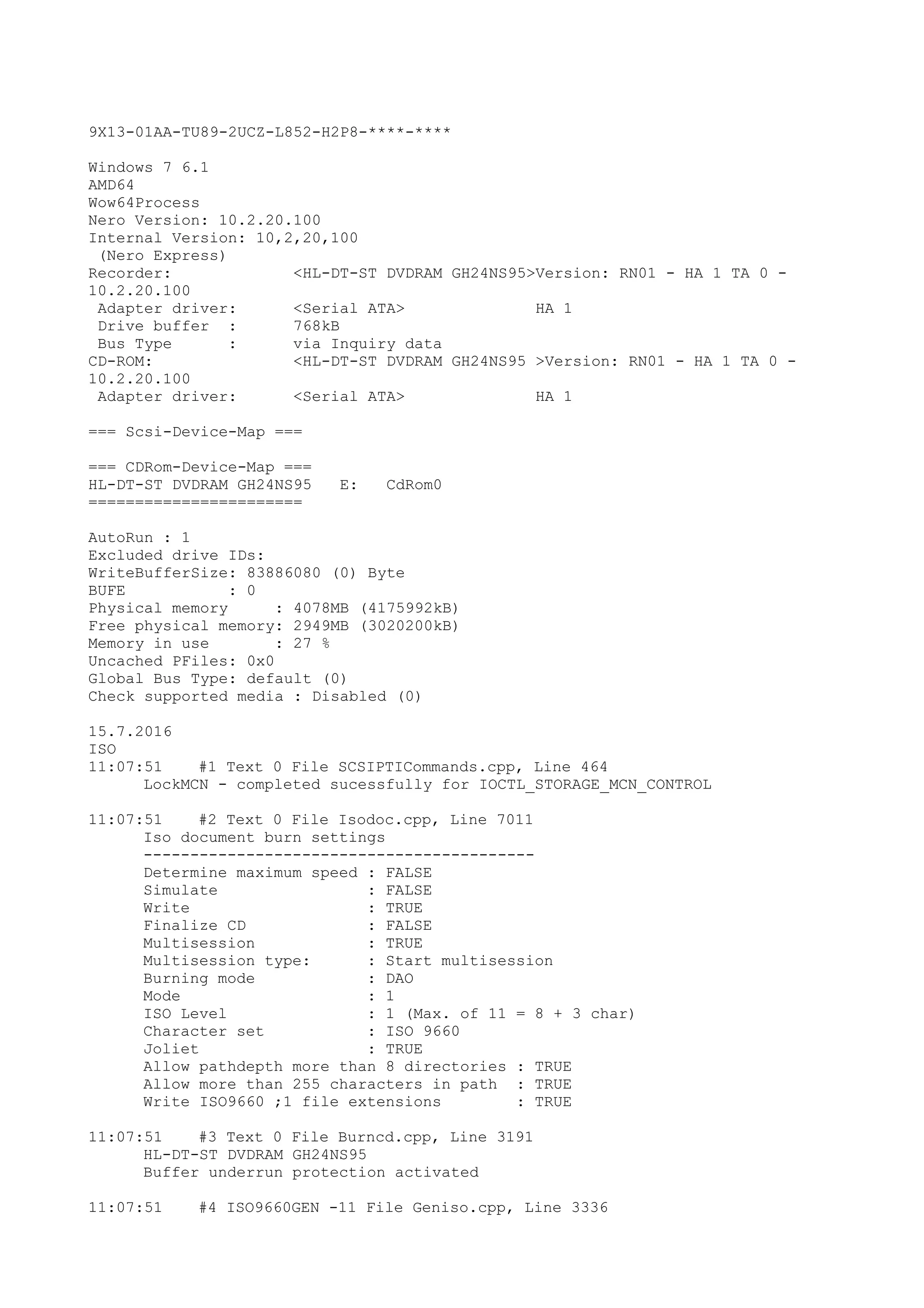 1. The document describes the burning of an ISO image file to a DVD using Nero burning software. It lists the hardware, software versions, burn settings and progress of the burning process.