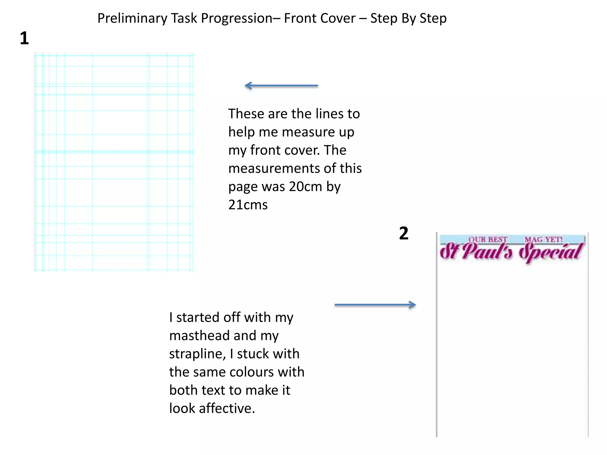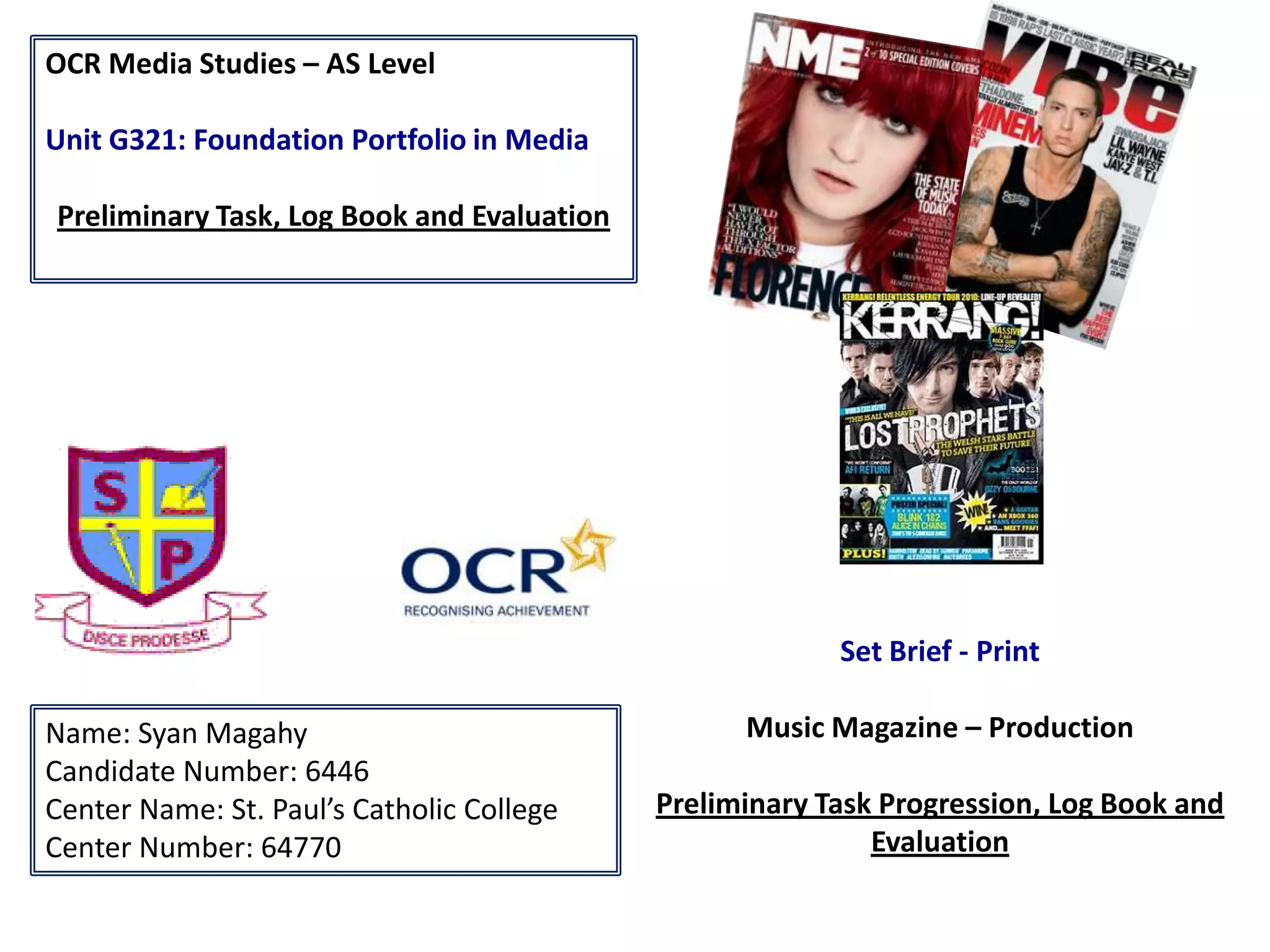 The document provides details on the preliminary tasks, log book, and evaluation for a music magazine production project. It includes step-by-step progressions for designing the front cover and contents page with annotations. It also includes a brainstorm for magazine name ideas. The log book section describes research conducted on established music magazines, their conventions, target audiences, and publishers. A survey was conducted to gather information from the target audience. The survey results are summarized.