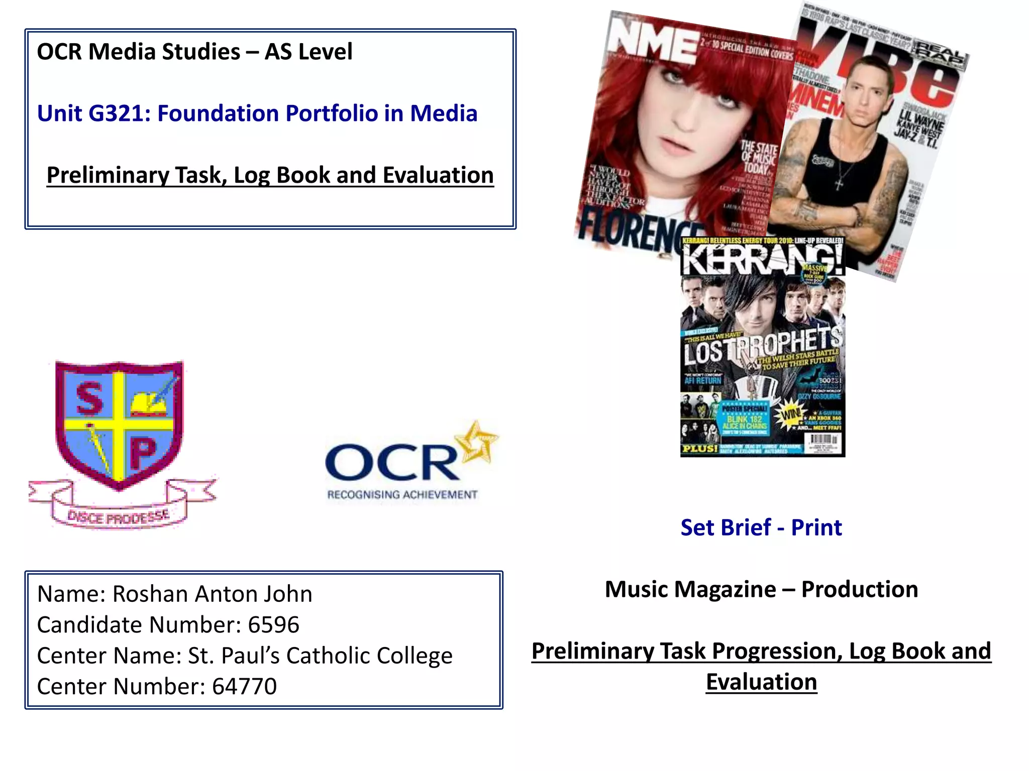 This document provides a log book and evaluation for a student's media studies coursework on producing a music magazine. The student has researched established music magazines like Q and XXL to inform their own magazine design. For Q magazine, their research found it targets mainly males aged 15-24 from middle-class backgrounds. Their research on XXL, a hip hop magazine, informed their decision to focus their own magazine on that genre. Details are provided on layout elements like mastheads, cover lines, and barcodes based on analyzing existing magazines. The student intends to replicate aspects of XXL's successful formula. The document outlines their progress on preliminary tasks like designing the magazine's front cover and contents page.