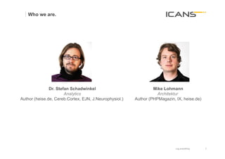 The document outlines the logging framework developed by icans GmbH, led by Dr. Stefan Schadwinkel and Mike Lohmann, which focuses on gathering and analyzing data from educational web applications, particularly in the context of poker teaching. It discusses the infrastructure, technologies, and strategies employed to log vast amounts of data, employing tools like Amazon S3 and Hadoop for scalable storage and analytics. The goal is to enhance business decision-making driven by complex data analytics and ensure user satisfaction by providing timely answers to their queries.