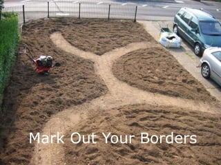 This document provides instructions for setting up an outdoor space, starting with marking borders, then installing a log roll and finishing by adding gravel paths and plants.