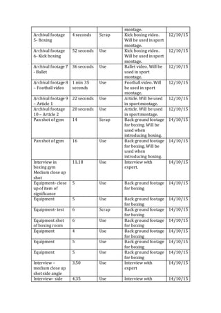 This document provides a description of archival footage and media collected for a documentary project. It includes the times, descriptions, intended uses, and dates of various clips filmed, including establishing shots, interviews, footage of different sports and activities, and b-roll footage. The clips will be used for openings, introductions of locations and sports, vox pops, montages, and as background footage.