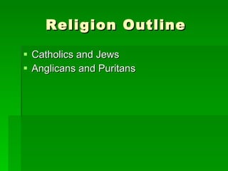 The document outlines the religious beliefs and practices of Catholics, Jews, Anglicans, and Puritans during the Renaissance period in England, specifically during the reign of Queen Elizabeth I. It discusses the origins and importance of each group, as well as their practitioners and practices. Catholicism was weakened after the Protestant Reformation while Judaism faced persecution and expulsions across Europe. The Anglican Church was established by King Henry VIII and became the official church under Elizabeth I, while the Puritans sought to purify the Anglican Church from Catholic influences.