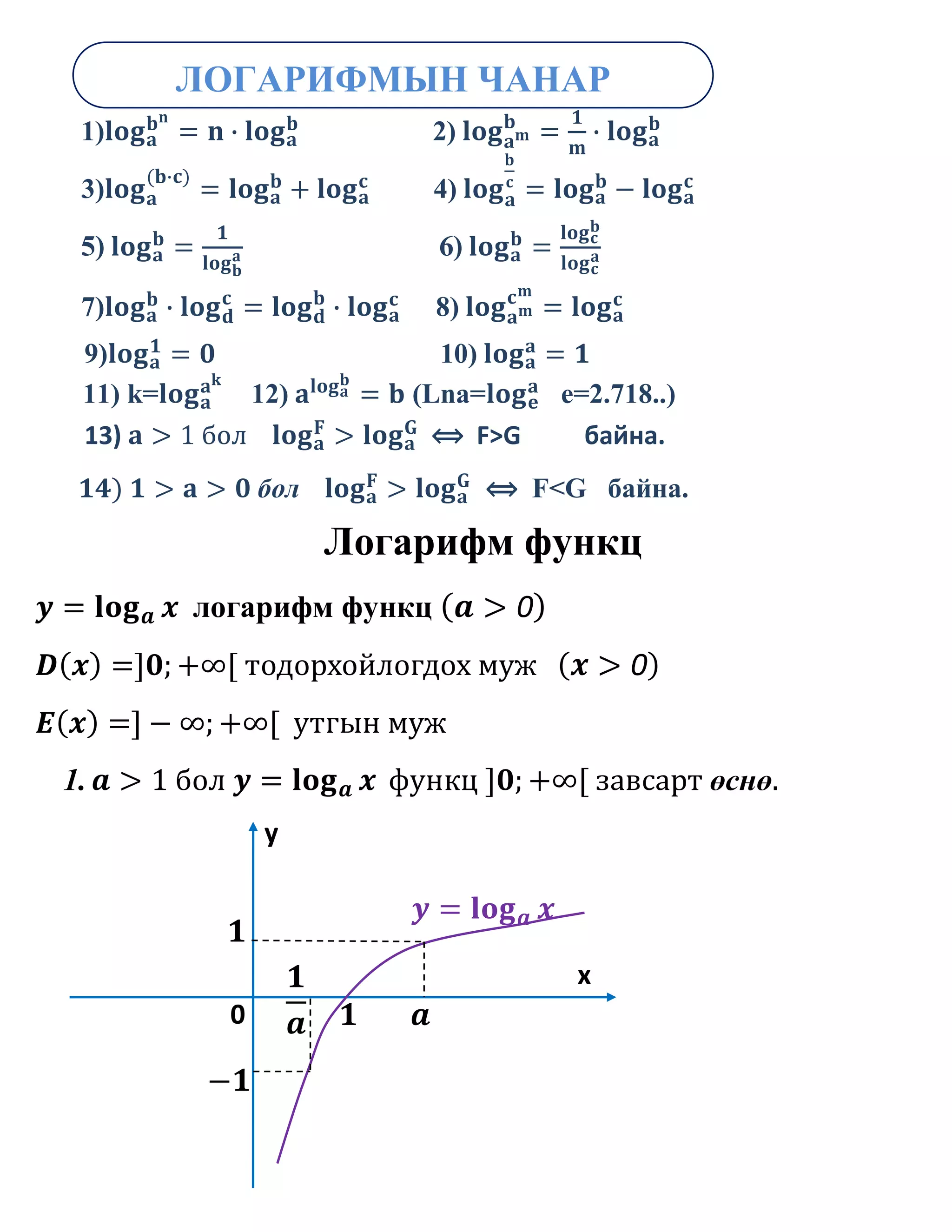 2) 3) 4) 5) 6) 7) 8) 9) 10) ⟺ F>G 11) k= 12) (Lna= e=2.718..) ⟺ F<G байна. 13) байна. Логарифм функц логарифм функц 1. y x 0